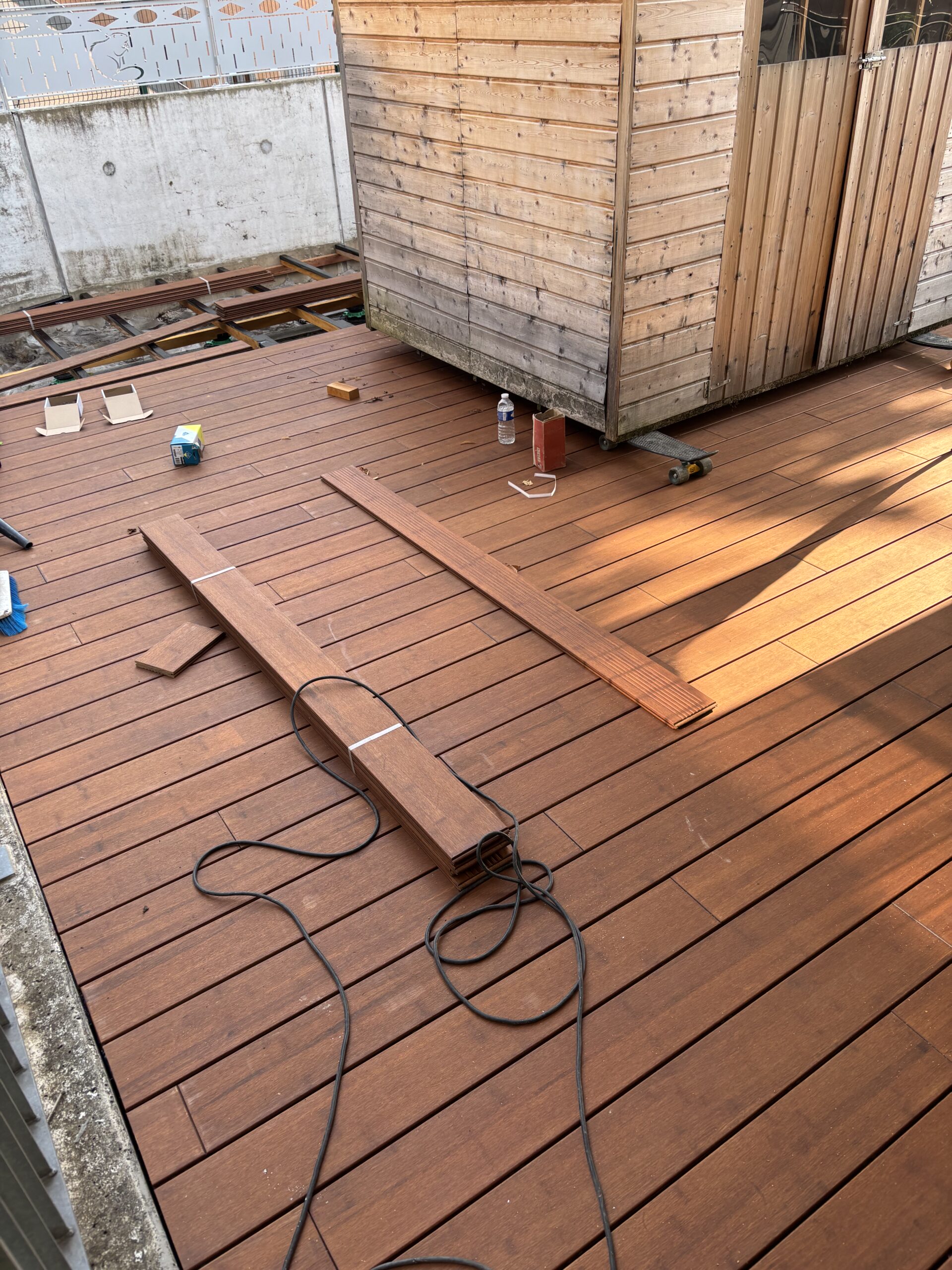 Aujourd’hui, nous avons entièrement repensé la terrasse. La structure a été réalisée en bois exotique, robuste et naturellement durable, avec un respect total des normes techniques. En surface, nous avons choisi le bambou : un matériau écologique, moderne et incroyablement résistant.