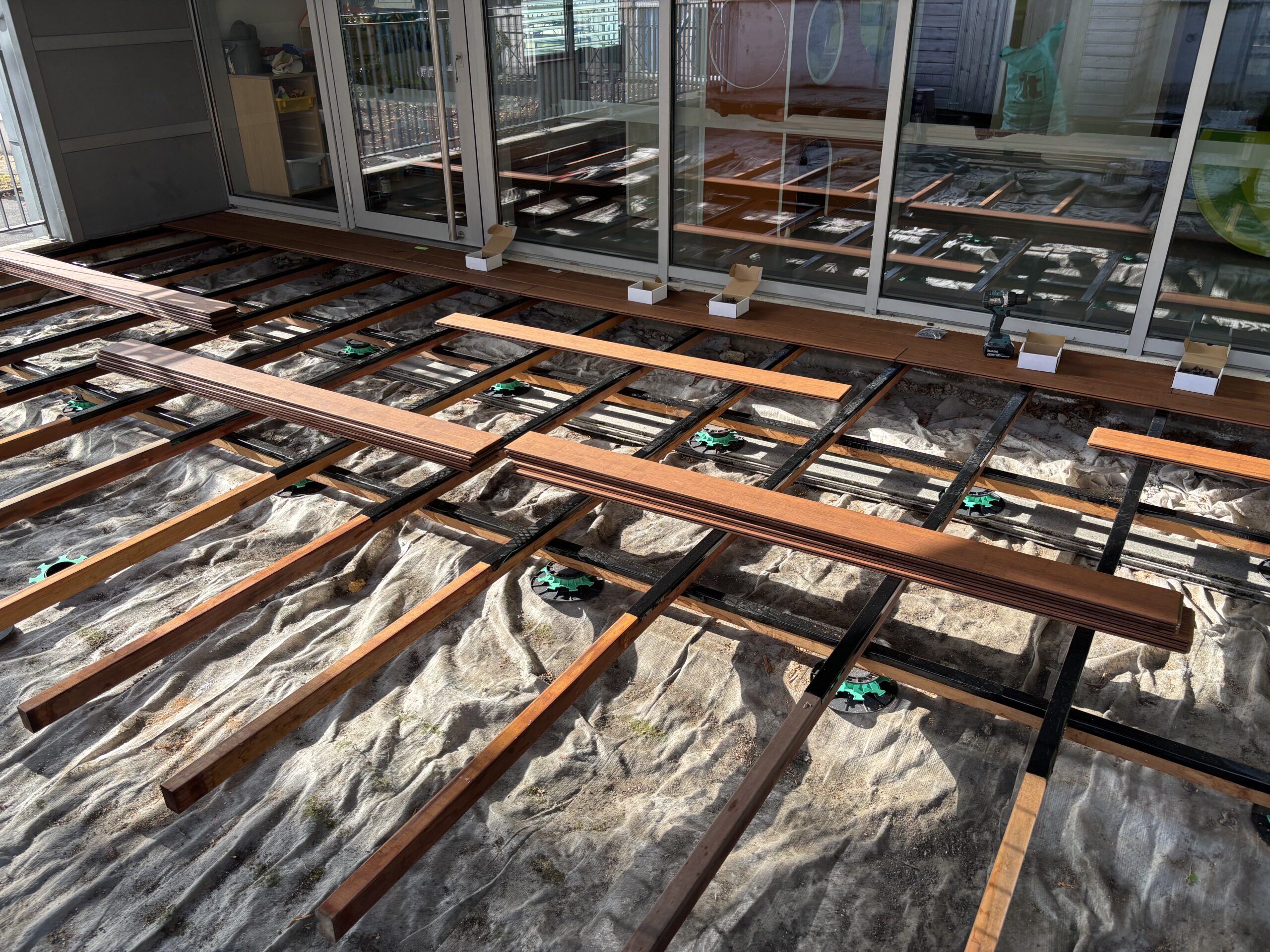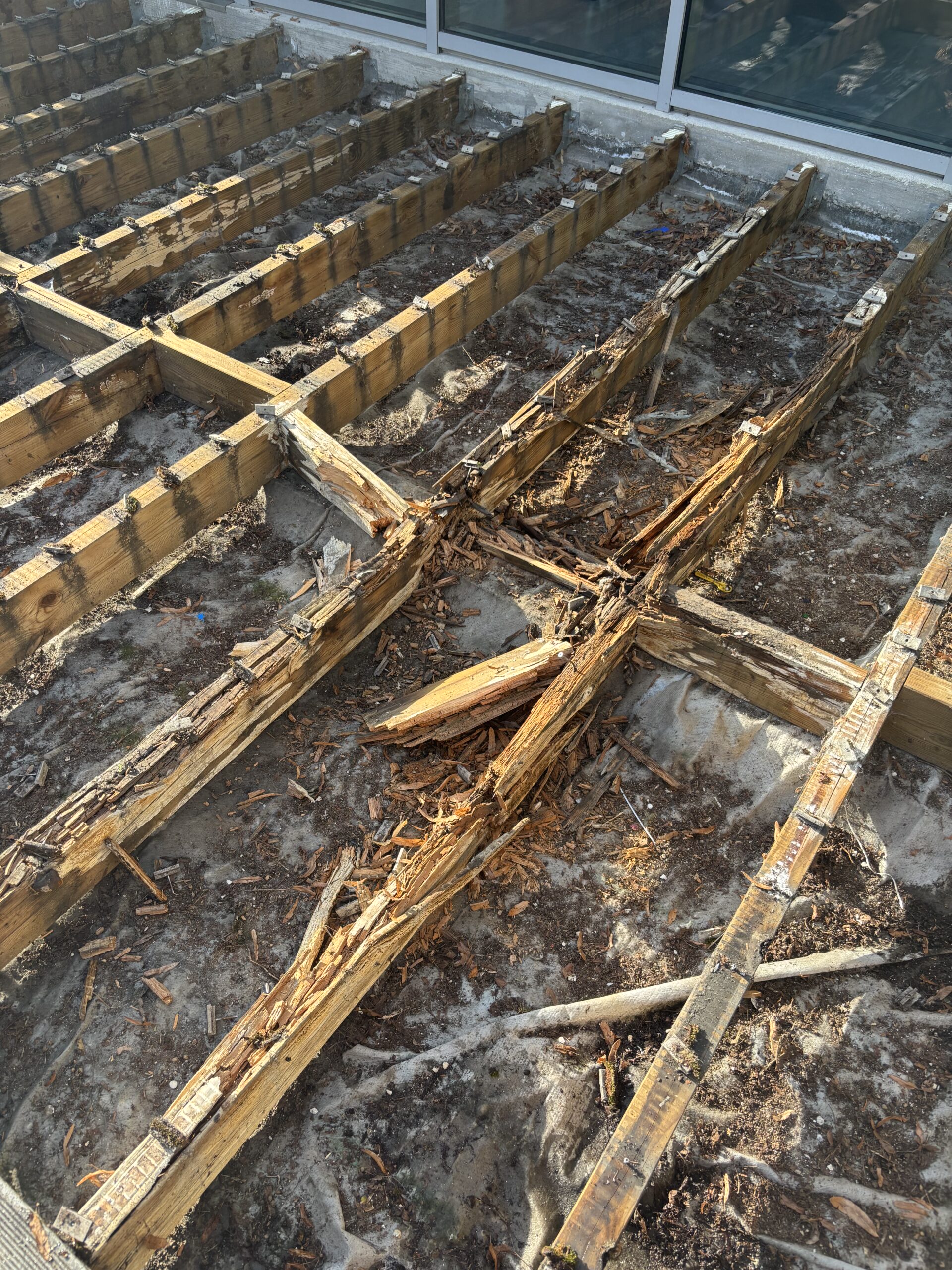 Il y a quelques années, cette terrasse avait été posée sur une simple structure en sapin, recouverte de lames composites. Sur le papier, cela semblait une bonne idée. En réalité, les règles de pose n’étaient pas respectées : écartements des lambourdes trop faibles, matériaux peu adaptés… Résultat : des lames qui bougeaient, se déformaient et finissaient par pourrir.