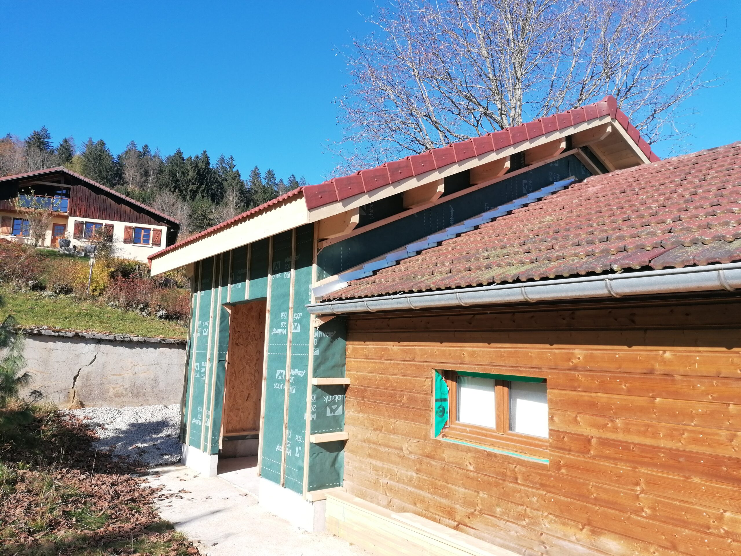 L’une de nos dernières réalisations a été cette superbe construction de gîte en bois, fruit d’un projet collaboratif entre notre équipe et nos clients professionnels et particuliers. Dans le cadre de ce projet, nous avons pris en charge la préparation complète des plans et des visuels 3D pour offrir une vision claire et réaliste de la future construction. Un kit sur mesure a été conçu, incluant les plans de montage, tous les matériaux en bois, les éléments d’isolation adaptés, ainsi que la quincaillerie nécessaire. La partie principale des travaux, notamment le montage de la structure, a été réalisée par un de nos clients professionnels, garantissant une base solide et précise pour la construction. Ensuite, notre client final a pris le relais sur les tâches accessibles, telles que la pose de l’isolation dans les emplacements prévus à cet effet et la pose du bardage extérieur, qu’il a pu réaliser de manière autonome, en suivant nos recommandations.